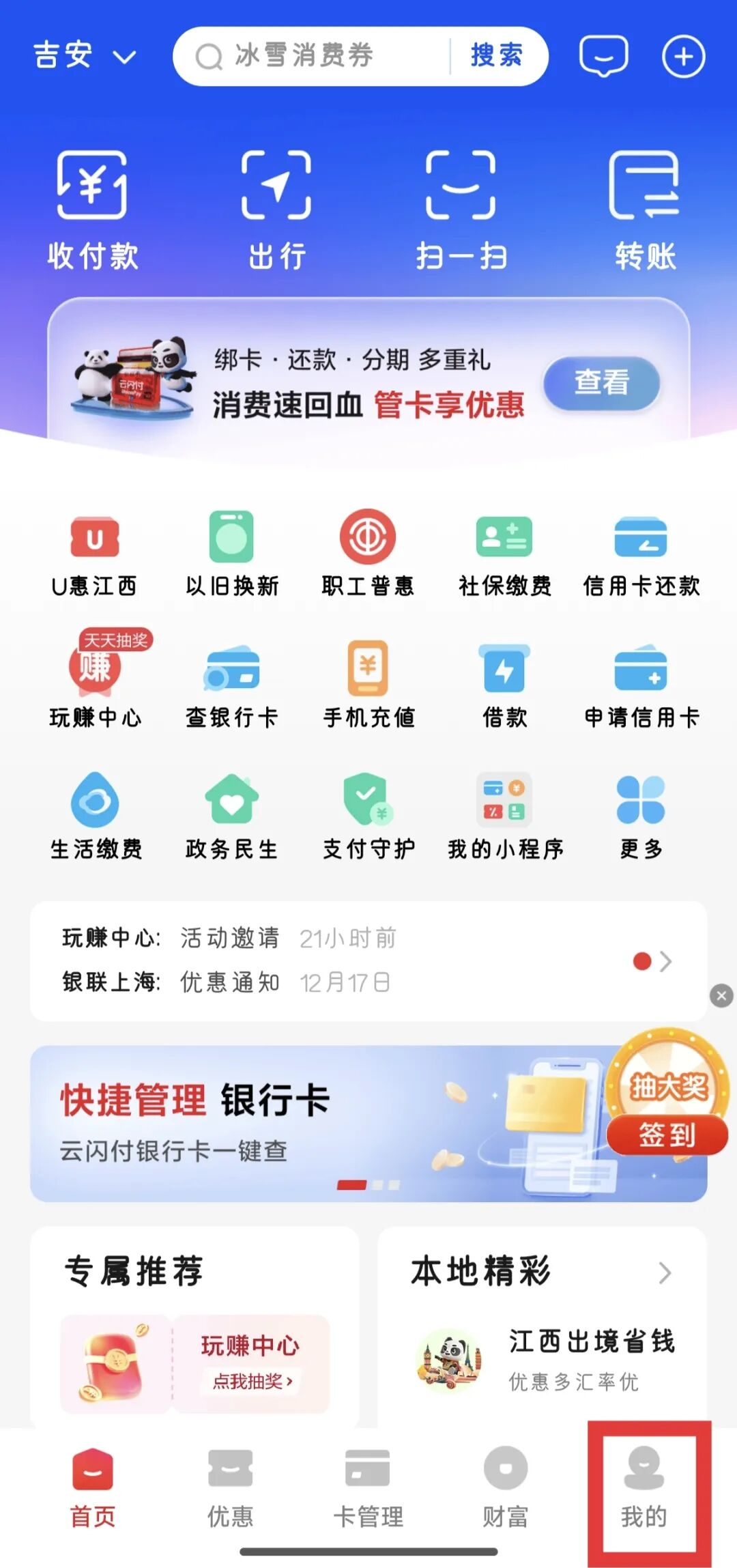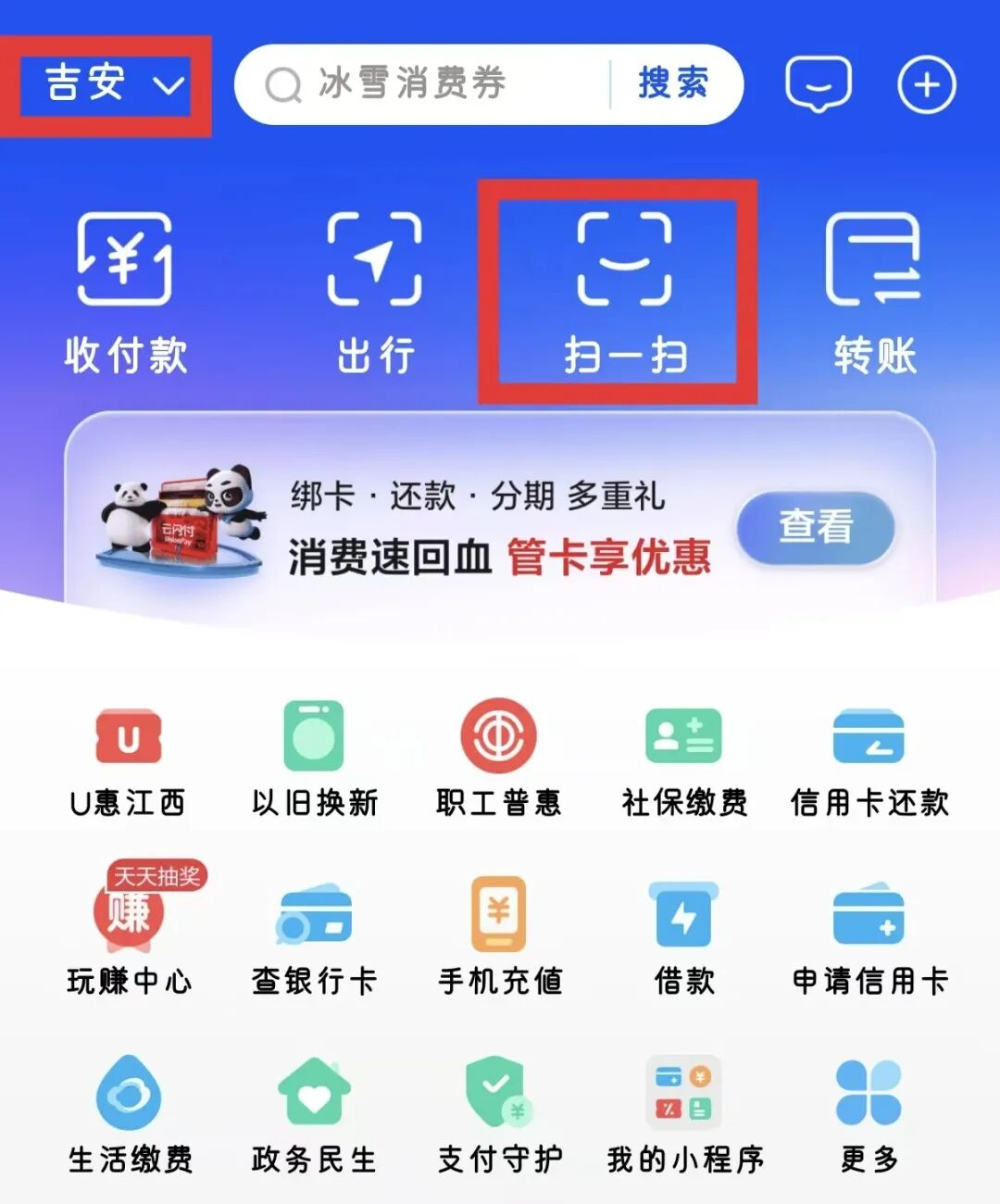 1、下载登录“云闪付”APP,定位吉安市,活动现场使用“扫一扫”扫码领券。