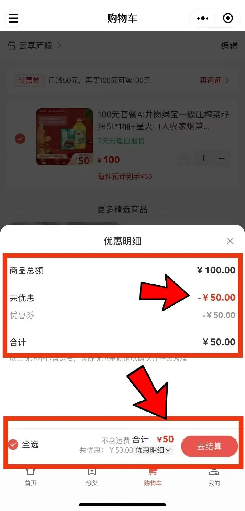 单笔结算金额满100元,点击去结算,显示已自动使用满100减50元优惠券,点击微信支付确认付款。