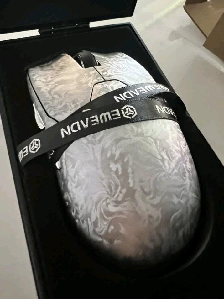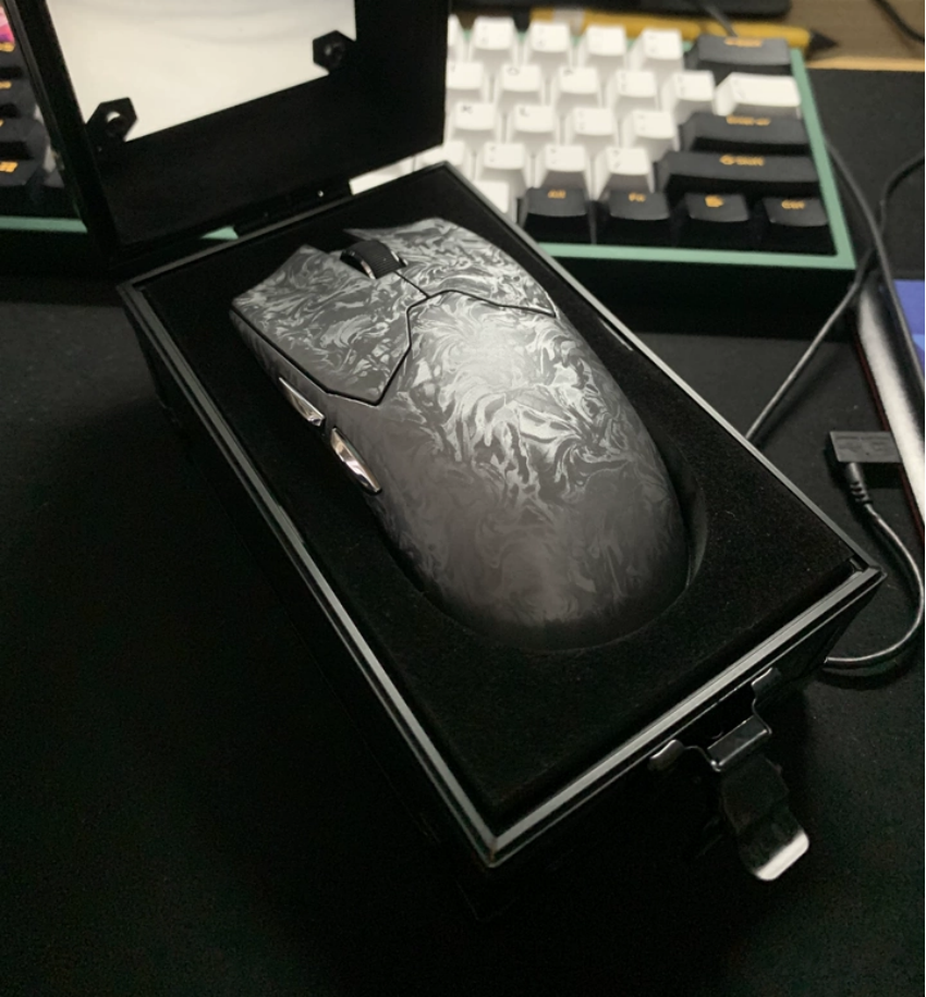我入手的是“月魄银”配色。鼠标本体最吸睛的,莫过于遍布外壳的复合碳纤维编织纹理。这不仅是视觉上的性能宣言,实际触摸时,表面覆盖的 Silk Shield冰感涂层带来了干燥、细腻且亲肤的独特触感,有效抵抗手汗打滑,兼顾了美观与实用。