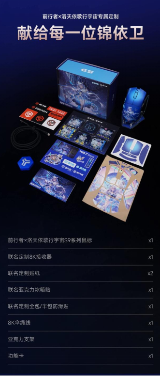 前行者S9洛天依联名鼠标并非一款单纯的粉丝向产品。它在拥有精美且独特的“歌行宇宙”涂装、丰富的周边配件(如亚克力支架、定制防滑贴、8K伞绳线等)的同时,在硬实力上完全没有妥协。Nordic54主控+PAW3950传感器+8KHz回报率的顶配组合加上轻量化手感,使其完全具备与市面上一线电竞鼠标一较高下的资本。对于各位锦依卫而言,它是收藏价值极高的周边,而对于追求极致性能的硬核玩家来说,这也是一个颜值与实力并存的外设利器。