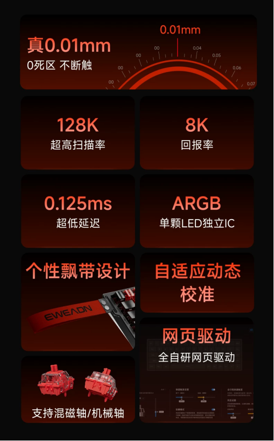 此外,“自适应动态校准”功能会在每次按键时进行实时动态校准,持续匹配轴体的当前状态,确保长期使用下的精度始终如一。